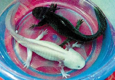 该店老板说这两条“怪鱼”叫六角蝾螈,是人工饲养繁殖的,身体非常软,“价钱不高,白色的300元,黑色的280元。它们非常厉害,还咬伤同缸其他的鱼。”老板指着鱼缸里一条有拳头大小的金鱼说,这条金鱼被它们咬伤翻肚。