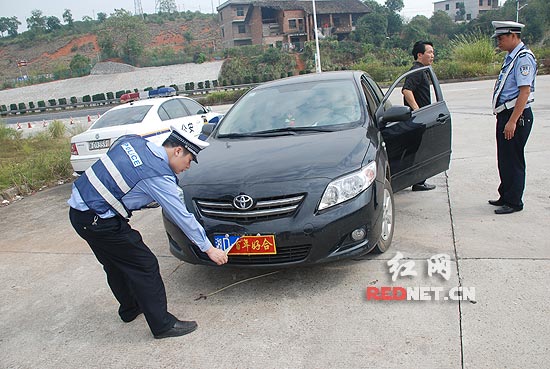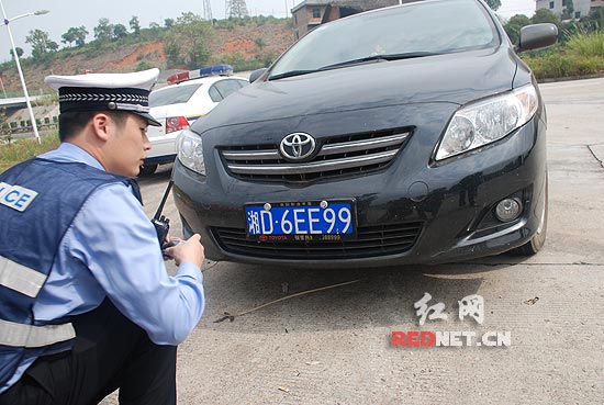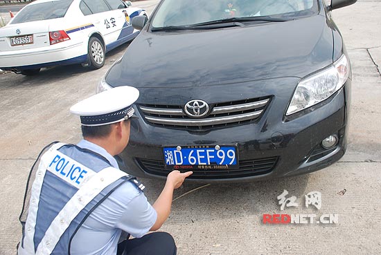 民警把“百年好合”的喜字贴撕掉后,感觉这辆挂着牌号为“湘D6EF99”的丰田车车牌看起来很别扭,仔细检查后发现,该车牌的字母“F”被改过,原车牌为“湘D6EE99”,前后车牌中的字母“E”均被一条小小的黑色胶带将字母最下方的一横遮住,从而变成字母“F”。