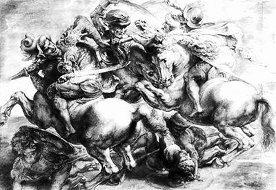 这幅画的中心部分绘有士兵和战马在战场上拼杀冲刺的场面,其细腻程度堪称解剖学和运动学研究的极致,因此吸引了包括拉斐尔在内的当时众多艺术家纷纷前往临摹学习。