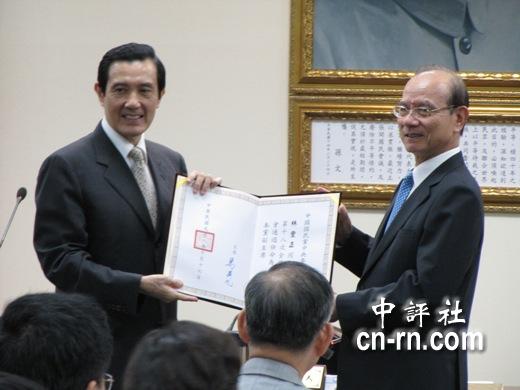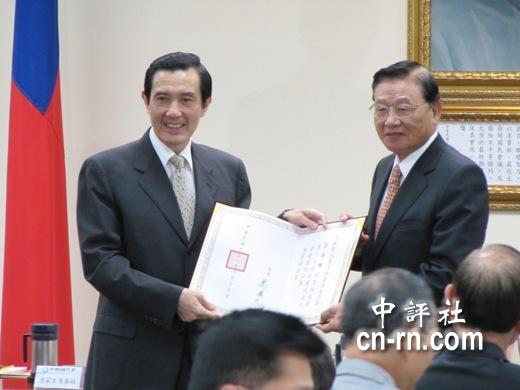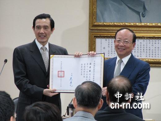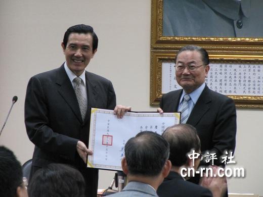 党主席马英九颁发副主席证书给江丙坤。(中评社 康子仁摄)