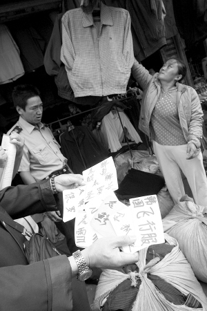 看到工商执法人员进门,围观群众和店主似乎并没有意识到销售“洋垃圾”服装属于违法行为。“又不是只有昆明在卖,湖南、上海也有啊。”店主一面交出写着进货地为“广东陆丰”的进货单,一面理直气壮地说,“我的营业执照是由市场统一办理的。”但他拒绝回答货物的成本价。而两名女性顾客依然旁若无人地翻看衣服,准备购买。