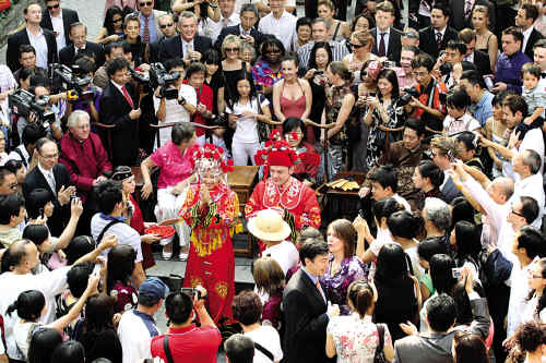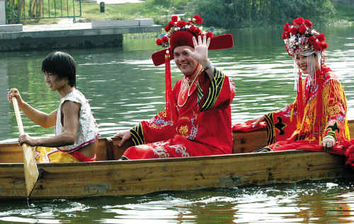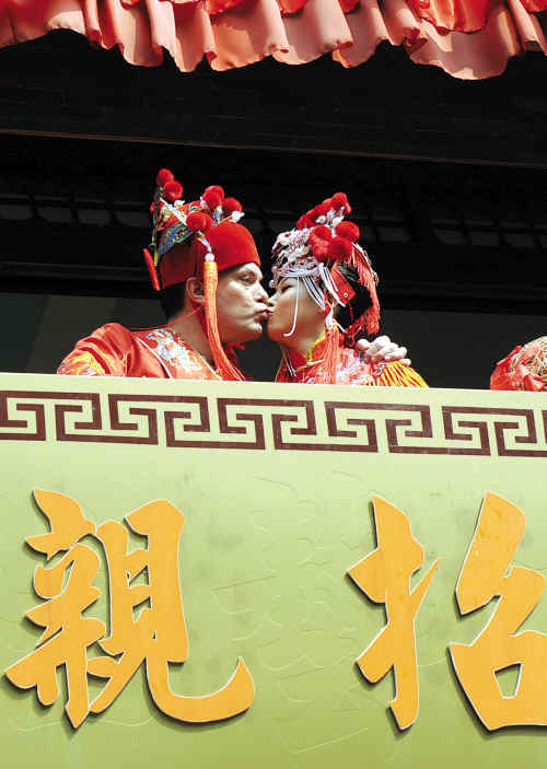 新快报讯 (记者 郭晓燕)大红花轿、迎亲仪仗队、拜天地、掀红罩……穿“凤冠霞帔”、“状元服”的纯中式婚礼昨日在岭南印象园内举办,300多外宾组成了声势浩大的亲友团。
