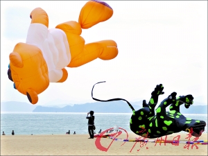 昨天的大梅沙,400米长的龙风筝、圆圆胖胖没有一根骨架的鲸鱼风筝、六只高速并飞而且啸声阵阵的特技风筝、飞舞中洒下糖果让孩子们雀跃追逐的糖果风筝……各式奇异的“万国”风筝与市民们随意放飞的风筝一起,在天空中竞相翱翔。
