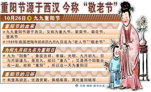 九九重阳节源于西汉,又称为重九节、茱萸节、菊花节、登高节,今天称作“敬老节”、“老人节”,是一个非常温馨的传统节日。北京师范大学中文学院民俗学教授肖放介绍说:“9月9日是重九,两个阳数两重,所以叫重阳,久久谐音是长久的久,久久就是使人生命长久,在重阳节祈求长寿的习俗在六朝就开始了,大家后来就把这个东西逐渐转化为敬老节,这是当代的一个转化。民俗里边,有重阳节办九老会,比如请九位老人一块儿来做一个宴会。”