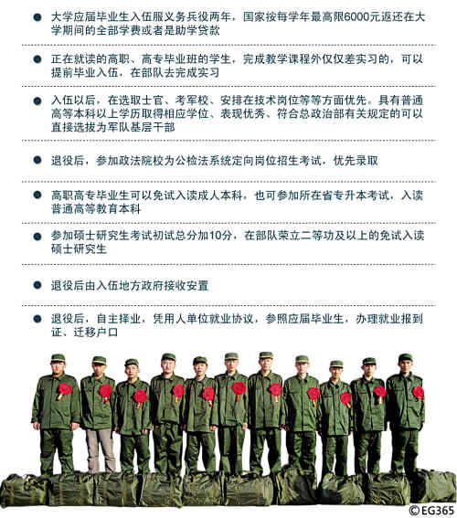 国家针对大学毕业生入伍在学费补偿、优先培养使用、免试或优惠升学等方面出台了一系列优惠政策。昨天,张浩明在解读政策时补充强调,大学毕业生退伍后,可享受国家关于义务兵退役的优待政策,由原征集地政府负责接收安置。张浩明介绍说,国家鼓励大学毕业生应征入伍服义务兵役的优惠政策有以下几个方面(见右图表)。