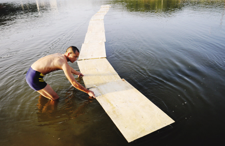 有了借助物,练成了“水上漂”也并非易事,一般人在未经过训练也只能在水面的三合板跑出去三五步,便沉入水中。