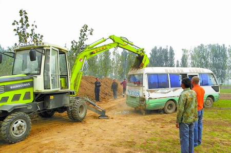 民警封锁现场,调查取证后设法将中巴车从麦地转移到路上。县教育部门领导获悉情况后,也及时派人赶赴现场了解情况,与交警部门和乡派出所共同商量处理办法。为避免人情干扰、报废车继续上路运营,经县政府交通安全委员会批准,决定将该车辆当场强制报废。民警随即调来一台铲车,现场将中巴车销毁。