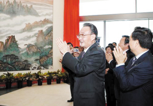 9月9日,在华盛顿中国驻美大使馆,正在美国进行正式友好访问的中国全国人大常委会委员长吴邦国,为全国人大赠送驻美使馆的巨幅国画《黄山朝晖》揭幕。红幕徐徐拉开,黄山群峰云海之巅,一轮朝阳喷薄而出,夺目的光芒照亮使馆的中央大厅,一时间,相机频闪,掌声雷动。