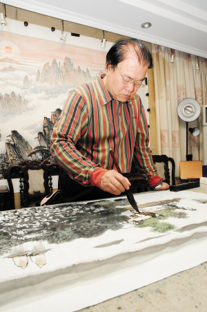 在继去年9月25日,张松的两幅国画成功入选随“神舟七号”飞越太空后,今年他又一次成功飞跃自己的事业巅峰。如何在短短20天内,完成全国人大交给的政治任务?如何既保持国画以墨为主的精髓,又适时创新,以明亮的色彩辉映外交场合所需的大气磅礴?带着这些疑问,记者走进张松那间不算宽大的画室,在墨香扑鼻的氛围中听他讲述那些成功背后鲜为人知的故事,那些巨幅国画问世的前前后后——
