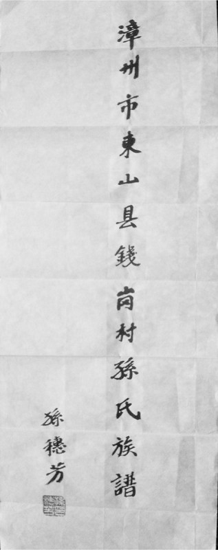 不久前,在与新加坡孙氏公会会长孙嘉和联系中,获悉东山县钱岗村正在编撰族谱一事后,孙穗芳欣然提笔写下 “漳州市东山县钱岗村孙氏族谱”的条幅。该条幅长0.60米,宽0.23米,下方署名“孙穗芳”并盖上丹红印章。