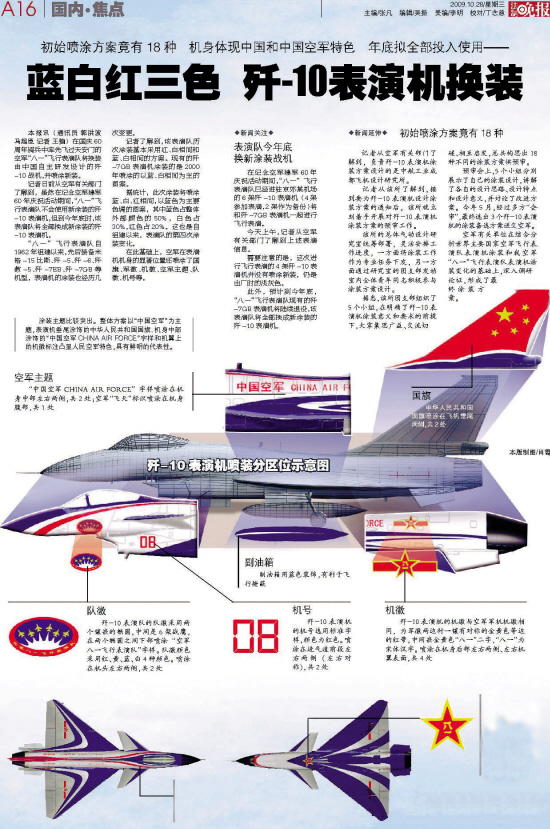 在国庆60周年阅兵中率先飞过天安门的空军“八一”飞行表演队年底前将换装由中国自主研发设计的歼-10战机,并喷涂新装。