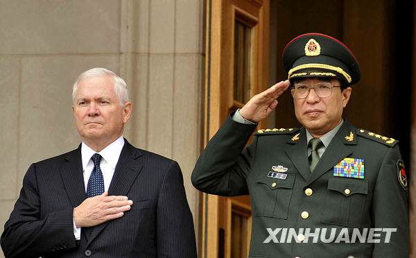 10月27日,美国国防部长罗伯特·盖茨在位于弗吉尼亚州阿灵顿县的美国国防部主持仪式,欢迎中国中央军委副主席徐才厚上将。当日,正在美国访问的徐才厚在五角大楼与美国国防部长罗伯特·盖茨举行了会谈。新华社记者张岩摄