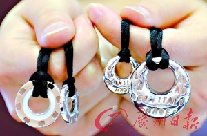 “你可以比较一下银首饰和钻石、黄金等首饰,银首饰的款式花样最多,最适合情侣之间互相表达爱意。”沈小姐说,银饰品很多都以“情侣饰品”的形式出现,很多饰品都别具匠心,造型新颖别致,这是其他材料的饰品做不到的。她拿出一只盒子,里面装着一大一小两只圆形的钟表样的银饰,她介绍说,这对情侣银饰名为“爱情时刻”,用钟表的造型,外圈刻有罗马文字,代表12个月,里圈代表日期,吊坠代表“爱心针”,可以等到具有纪念意义的日子,作为爱情的纪念。中间的心点是红蓝宝石。