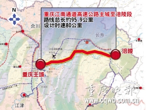 主城至涪陵段起于绕城高速公路东段茶园开发区附近,经过南岸区、巴南区、长寿区、涪陵区,接在建的涪陵至丰都、南川至涪陵高速公路。另在巴南双河口处设长寿连接线至长寿晏家工业园、长寿化工园。路线总长约95.9公里,设计速度80公里/小时,沥青混凝土路面。工程力争年内开工,建设工期4年。
