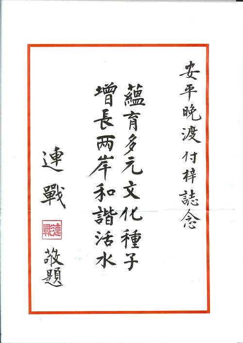 “海峡27城市历史文化系列”台湾部分7种,由台湾图书出版事业协会、海峡文艺出版社、福建闽台图书有限公司三方联合打造。在今年在厦门举行的海峡论坛期间,海峡两岸出版发行界共同签署该项目的合作协议,经过三方近半年以来的不懈努力,《安平晚渡——台南》作为海峡27城市历史文化系列台湾部分7种的第一部首先面世。中国国民党荣誉主席连战专门为该书的付梓题写“蕴育多元文化种子,增进两岸和谐活水”表示祝贺。