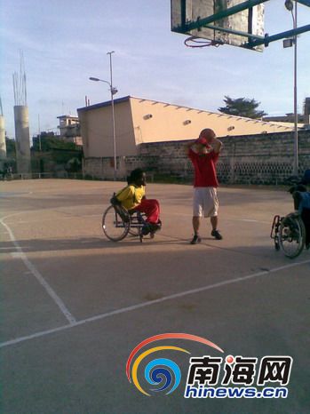 这时,马里教练走过来让我给队员传球,帮助他们训练。我拿起球站到篮底,按照马教练说的给滑行上篮的队员传球。传球对我来说是最熟悉不过了,但不知道是因为紧张还是兴奋,给坐在轮椅上的人传球我的手确实稍微感到有点发抖。我感到传出去的每一个球都代表一份爱心和一份尊重。