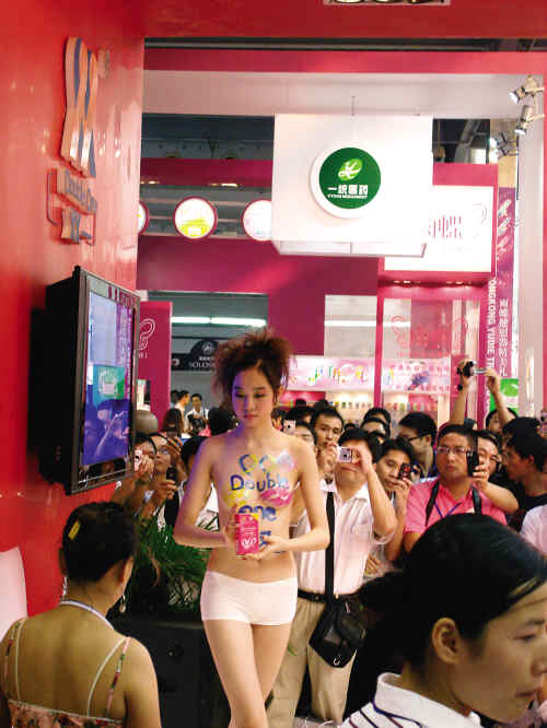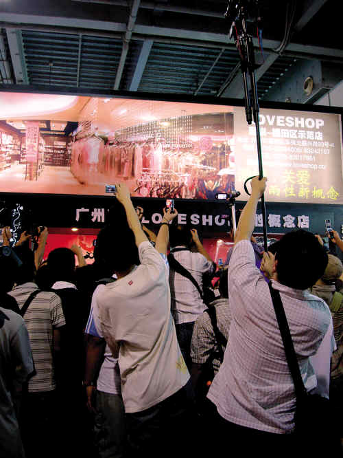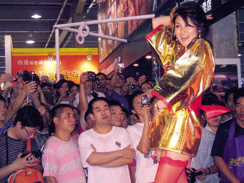 更为火爆的是T台对面的商家自搭的三平方米舞台——一群身穿各种制服的靓女大跳钢管舞“抢风头”。在一段钢管舞、制服诱惑表演“预热”后,台前的观众早已把舞台围得密不透风,就连舞台侧面的缝隙也站满了人向内望。记者身后、头顶被重型的摄像枪、长镜头相机“包围”,根本难以站直观看,工作人员不得不拉起防护栏维持秩序。