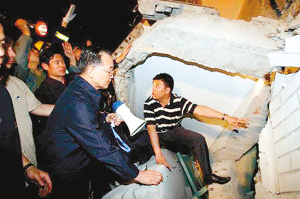 温家宝手持话筒对被压在废墟中的民众喊话:大家再坚持一下,部队正在抢救你们!