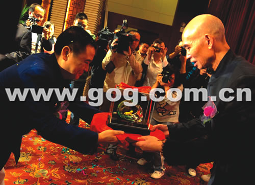 金黔在线讯 “李氏十年绝艺,伯牙遍地子期。清脆幽默悦耳,好个西南名人。”十多年前,贵阳人蒲先生到成都出差,在伯清茶馆为李伯清先生写下这首藏头诗。青丝(李伯清粉丝自称)蒲先生从本报知道李伯清将在贵阳收徒的消息后,昨天晚上,再次来到李伯清贵阳收徒仪式现场,并且带上礼物特别恭喜李老师在贵阳收到散打评书的传承人。