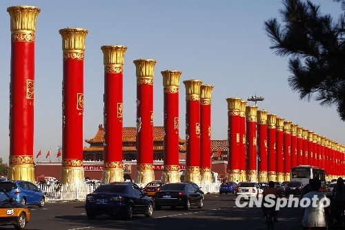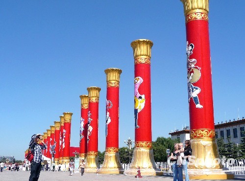 9月15日,28根巨大的民族团结柱在天安门广场东侧竖起,吸引不少游客的目光。这些柱子能抗瞬间十一级大风,还安装了避雷针。作为新中国成立六十周年国庆庆典背景之一,天安门广场计划安置56根民族团结柱,每根民族柱13.6米高,26吨重,以“中国红”和“金色”为主色,柱子上均绘有一对穿着民族服装的男女舞者,代表中国56个民族。中新社发郑雄增 摄版权声明:凡注有“cnsphoto”字样的图片版权均属中国新闻网,未经书面授权,不得转载使用。【更多图片】