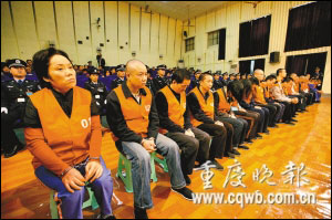 谢才萍(左一)黑社会团伙在法庭上等待法官宣判 记者 杨帆 摄