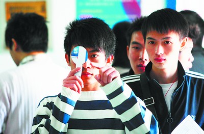 昨日上午,在天心区裕南街冬季征兵初检站里,准备参加征兵的男青年正排队进行视力测试,长沙今冬征兵工作正全面展开,今冬试点全部征集高中以上青年。陈飞 摄