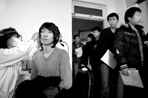 体检内容包括内外科中的眼、耳、听力、身高、体重、心电图、血尿,以及心理、毒品、艾滋病等多项检查,在视力检查室,等待检查的应届学生已排起了长队,主检医生对应征青年视力的各项指标进行了检查,包括近视、斜视、色盲等内容。主检医生告诉记者,每年因视力不合格的占应征者的30%左右。