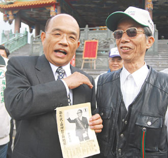 中新网11月4日电台当局前“行政院长”苏贞昌3日到宜兰辅选,在苏澳遇到支持者林阿山,该人拿出30年前苏贞昌参选的老文宣跟他要签名。苏贞昌看着当年文宣上的照片,幽默地说“证明我以前是有头发的”,在场的人都笑翻了。