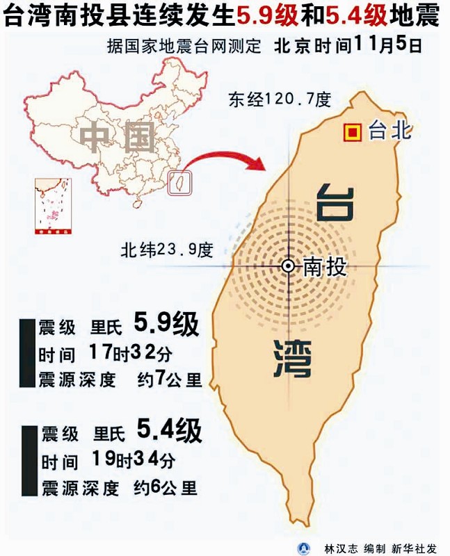 据新华社台北11月5日电 台湾南投县5日下午5时32分发生5.9级地震,震源深度约7公里,台澎各地有感。截至当晚7时30分,未有重大灾情传出。