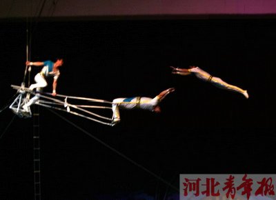 《空中浪桥飞人》节目:是把朝鲜民族游戏——荡秋千发展成为空中飞人的世界名作。它以世界杂坛上首创的转四周14米远飞、侧身三周兼后转两周等高难动作表现朝鲜人民的勇敢和智慧,是世界上最优秀的空中节目之一。在吴桥国际杂技艺术节中曾多次获得金狮奖。■摄/本报记者任全军