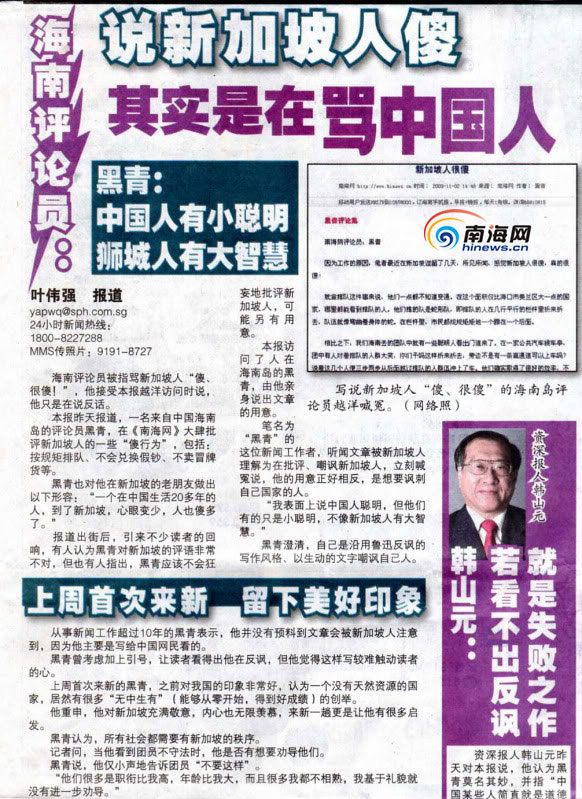 南海网11月7日消息:由南海网评论员黑靑的评论《新加坡人很傻》在新加坡引起的讨论继续升温,不过讨论的风向标已发生明显变化。《新明日报》11月4日详细澄清了黑青的看法,《南洋视界》论坛也转载了黑青的另2篇评论《中国人很聪明》《我的痛,新加坡不懂》以及南海网的2篇新闻,部分新加坡网民则开始新加坡和中国文化的差异讨论。