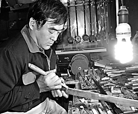 其次是板胡的制作阶段,现在板胡的标准长度是74—78厘米,琴头一般分为龙头和马蹄两种,胡头形状全部采用纯手工雕刻。在琴杆的制作阶段,首先要进行选材,然后根据木丝的纹理进行加