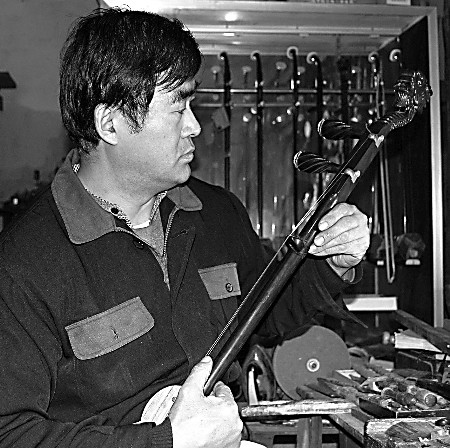 5日,记者带着好奇走进这家平凡而古老的店铺,一座略显陈旧和杂乱的小院内,一位高大魁梧的中年男人戴着老花镜,端坐在屋内简陋的工作台前,头顶悬着一盏白炽灯,专心致志地在为一把刚刚完成的板胡试音,简单的音符飘浮在整个庭院内,让人感觉到美妙和温暖。这位正在专心制作板胡的中年人就是刘世瑞。