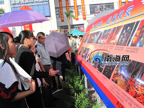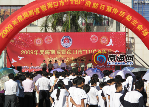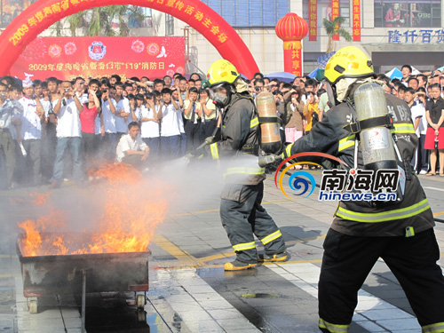 南海网11月9日消息(南海网记者陈望):2009年11月9日是全国第19个消防日。上午9时,省总队和市公安消防支队在海口上邦百汇城开展了119海南省暨海口市消防宣传日活动。通过发放宣传资料、参观消防图片展、消防装备展示及组织人员现场灭火演练等活动,使近3000市民受到消防安全教育。
