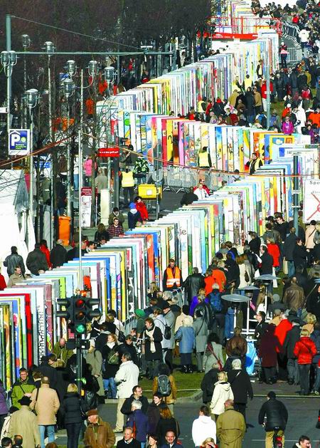 11月7日,1000块巨型多米诺墙体模型竖立在德国柏林墙遗址附近,从勃兰登堡门到波茨坦广场绵延1.5公里。