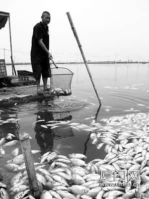 看着眼前25亩的鱼塘内,死鱼一片片地聚集,海沧霞阳的杨卫兵腿都发软了。鱼塘被死鱼的臭味和鱼腥味包围着,两条小船已经打捞了4天,还没有把死鱼清理干净。