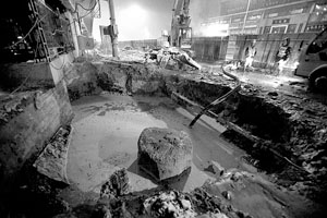 图为爆裂的自来水管形成了一个水坑,施工人员正抓紧时间抽水