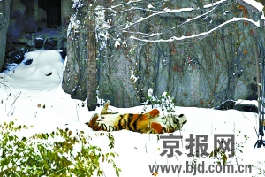 北京动物安然御雨雪 大象睡"火炕"河马泡"温泉"