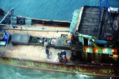 船上的其他人员,随后将后面昏迷的3人救出了鱼舱。船老大报警,请求救助直升机救援。