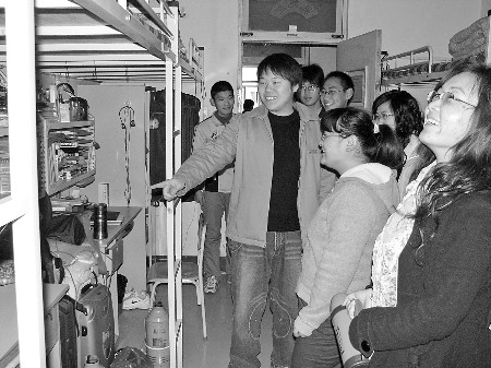 “哇,这么干净,肯定临时突击过,不过这个被子叠得还不行……”9日上午10点,刚刚下课的山东农业大学植物保护学院07级2班和07级3班的十余名女生走进男生公寓。看到女生到来,男生们有的热情担当起“导游”,有的则腼腆地跟在女生后面。经了解,9日是“男生宿舍开放日”,5个以上的女生只要申请,就可以在班干部的带领下去男生宿舍突击参观检查。“自从有了宿舍开放日,连周末都不敢睡懒觉了,早早起床叠好被子,就怕在女生面前跌了面儿”,植保学院一男生说。