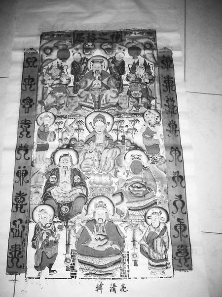 倘若说开封朱仙镇木版年画承载的主要是民俗生活,那么滑县木版年画承载的则主要是精神信仰;倘若开封朱仙镇木版年画主要贴在门上,那么滑县木版年画则是挂在墙上,乃至主要作为中堂,挂在堂屋正中,以资供奉祭祀神佛、祖先。