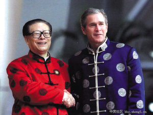 2001年在上海召开的APEC会议,穿着唐装的领导人和代表们分外抢眼。这套特制的服装只有上衣,分外套和衬衫两件。团花织锦缎中式对襟夹外套,有红、绿、蓝、咖啡、绛红、黑6种颜色,细致的手工滚边、古色古香的盘花纽,颇具东方韵味。整套服装在设计上既有传统中式服装的古朴风韵,又加入了现代时装洒脱自如的设计概念。