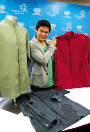 2009新加坡亚太经合组织筹委会日前向媒体公布了即将召开的APEC峰会领导人服装。男装分为绿、红、灰三种颜色,面料为亚麻,服装的绣花和扣子都采用了典雅的荷花造型;女装则为红色丝绸面料,整体设计简洁而现代,同时还体现了东南亚浓郁的民族风情。