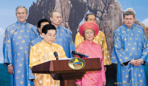 2006年第14次APEC会议在越南举行,各国领导人身穿越南的“奥黛”亮相。据报道,“奥黛”是一种丝质长衫,在越南外交部礼宾官员选定的5种颜色中,蓝色最受男性领导人欢迎,布什、普京和安倍晋三当时都选择以蓝衣亮相。此次峰会礼服由越南最知名的服装设计师明汉(译音)设计,并请25名裁缝花了好几个月时间缝制。