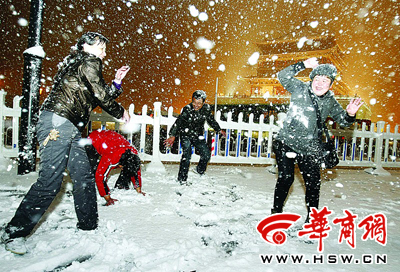 昨日,入夜后雪花越飘越大。从扶风来西安旅游的樊红侠(右)和朋友们在钟楼下打起了雪仗 本报记者 黄利健摄