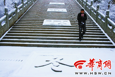 延安凤凰山登山台阶上的“冬”字被积雪覆盖本报记者 王卫平 摄