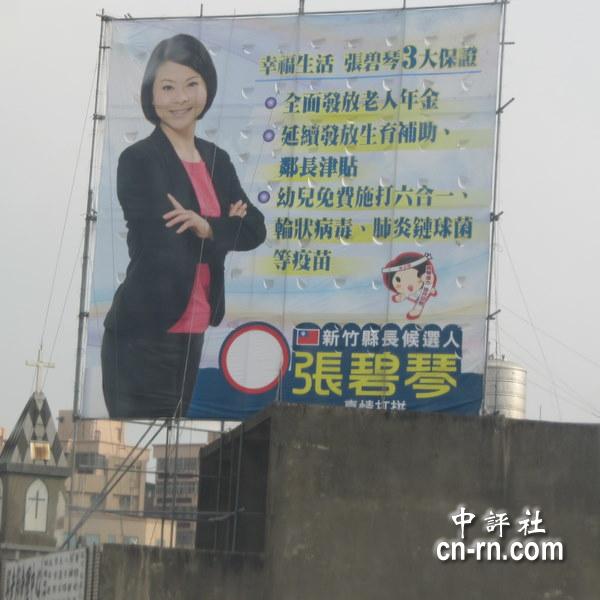 张碧琴虽然已经脱党参选,但选举看板上仍有挂着青天白日旗,争取蓝军选民。