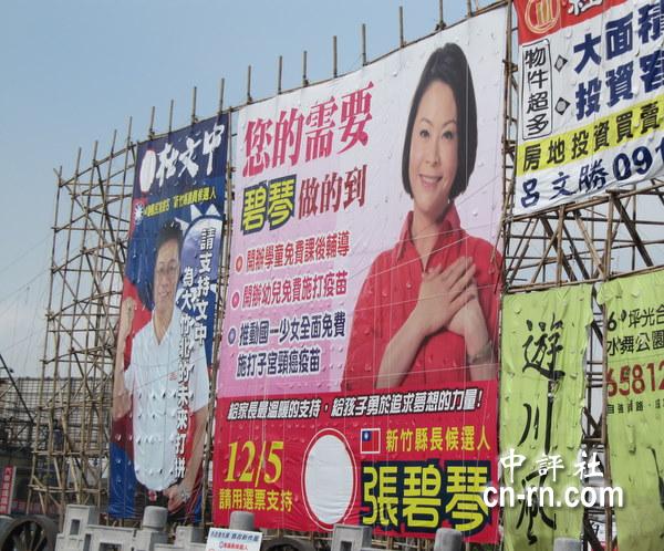 据中评社报道,邱、张两方战况激烈,只要高速公路下交流道进入新竹县,就可以明显感受到。若路旁左边有邱镜淳的竞选广告,右边就一定看得到张碧琴的竞选看板,两人竞选看板竞相出现,且都非常明显。两人为了争取蓝营选民支持,邱镜淳强调自己是国民党提名人;张碧琴则是在选举看板上,放了一面国旗强调自己的出身。