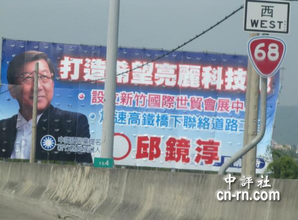新竹县长选举战况激烈,新竹县的快速道路旁都可以看到候选人邱镜淳的选举看板,邱特别强调自己是国民党提名候选人。