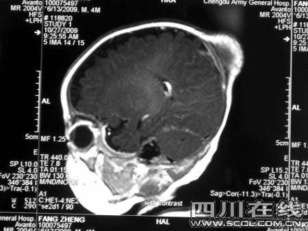 10多天后,家人带经经到另外一家医院求诊。此时,他头顶上的包已膨胀到鸡蛋大小。询问病史后,医生考虑到这个包的生长速度太快,便怀疑是恶性肿瘤。“孩子太小,手术风险太大,建议放弃治疗,孩子能活多久就是多久。”医生的话,把一家人推入绝望境地。经经的妈妈坚持不放弃,10月26日,带他来到成都军区总医院神经外科求医。医生贺伟旗博士说,当时经经头上的包已有青苹果大小。